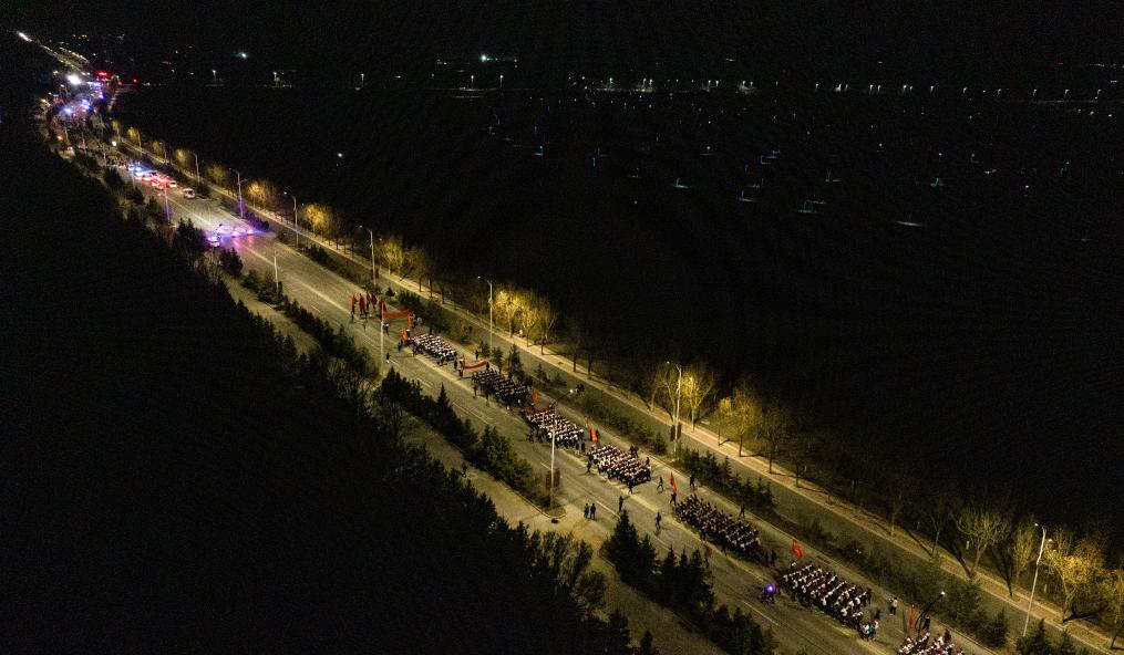 4月3日凌晨,參加徒步祭英烈活動(dòng)的師生從固原市城區(qū)出發(fā),前往位于彭陽(yáng)縣的任山河烈士陵園祭奠英烈(無(wú)人機(jī)照片)。