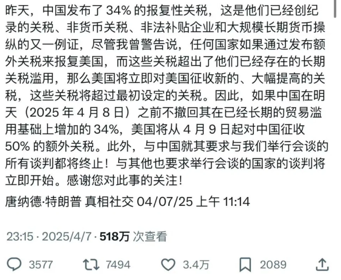 一覺醒來,特朗普再發(fā)威脅,警告中國在4月8號前取消報復,不然4月9號就對中國再加50%額外關稅,此外所有和中國的談判都會中止,而和其他國家的談判將立即開始。