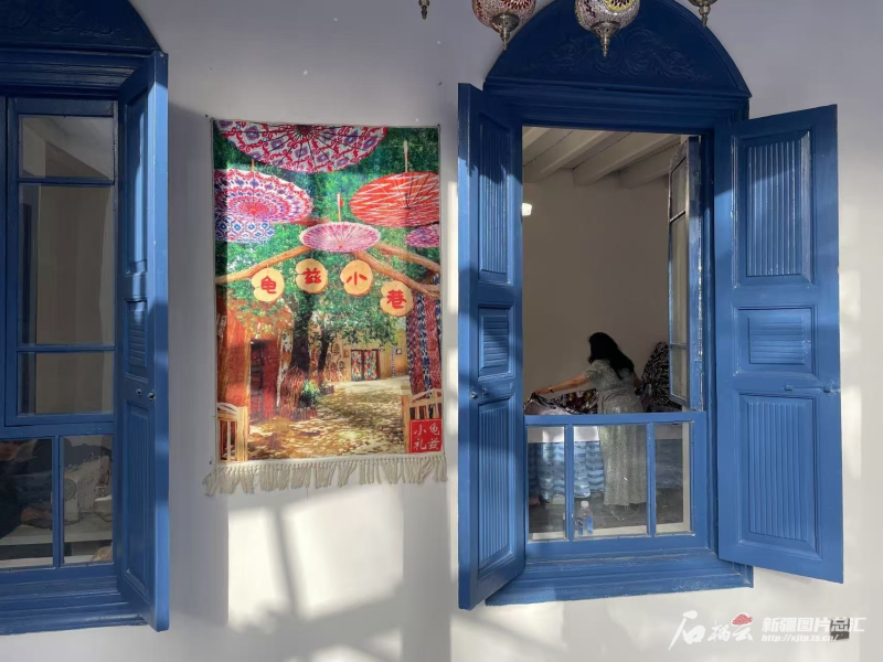 修舊如舊,喚醒了老街巷?,F(xiàn)在,這里有當?shù)鼐用耖_的茶館和馕鋪,也有外地人經(jīng)營的咖啡館和旅拍店、服裝店。斑駁的土墻與雕花的木門間,墻上懸掛的各色瓷盤、托盤,無聲訴說著歲月的變遷。2024年,這里接待游客90萬人次,成為庫車市文旅新地標。