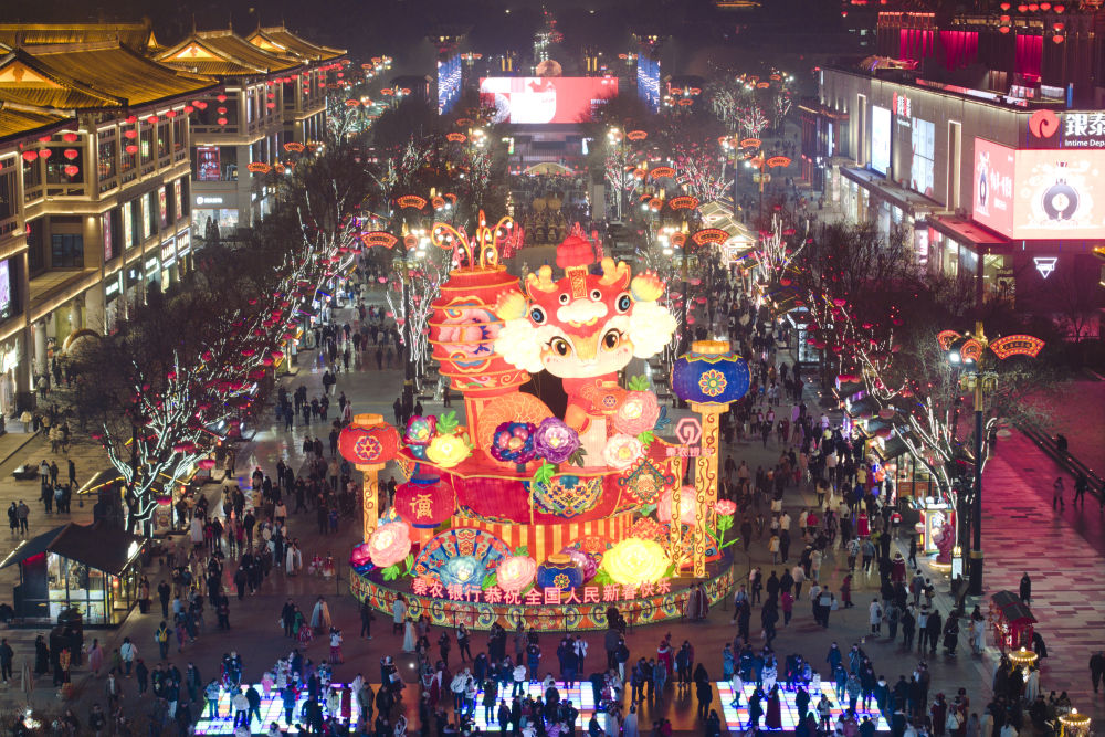 市民游客在西安大唐不夜城游玩、消費(fèi)(1月22日攝,無(wú)人機(jī)照片)。新華社記者 邵瑞 攝