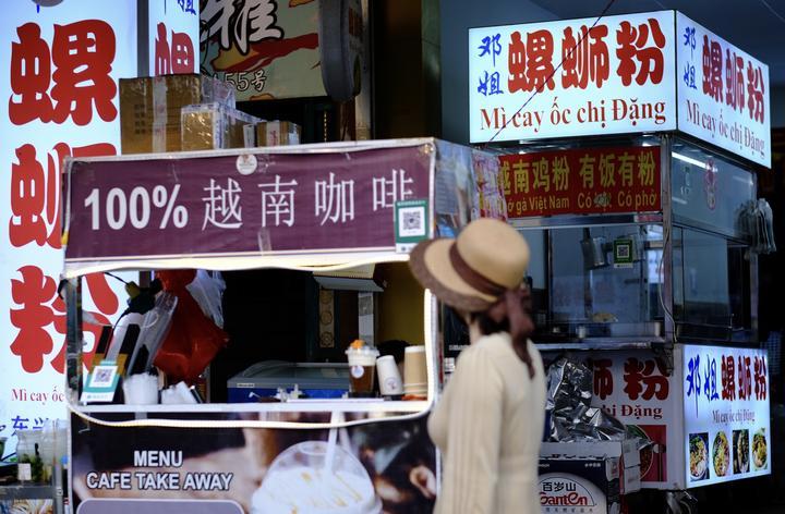這是在中國東興口岸拍攝的街景。中越兩國游客在這里品嘗特色美食、咖啡。新華社記者鄭開君攝