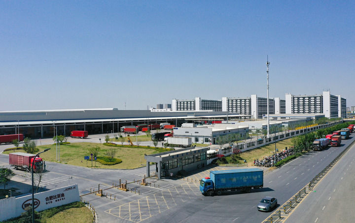 春風(fēng)和煦,楊柳輕舞,從合肥市區(qū)驅(qū)車向北約35公里,行至長(zhǎng)豐縣中南部的下塘鎮(zhèn),以比亞迪命名的主干道上,運(yùn)送汽車零部件的貨車排成長(zhǎng)長(zhǎng)一列,魚貫而入比亞迪合肥基地園區(qū)。