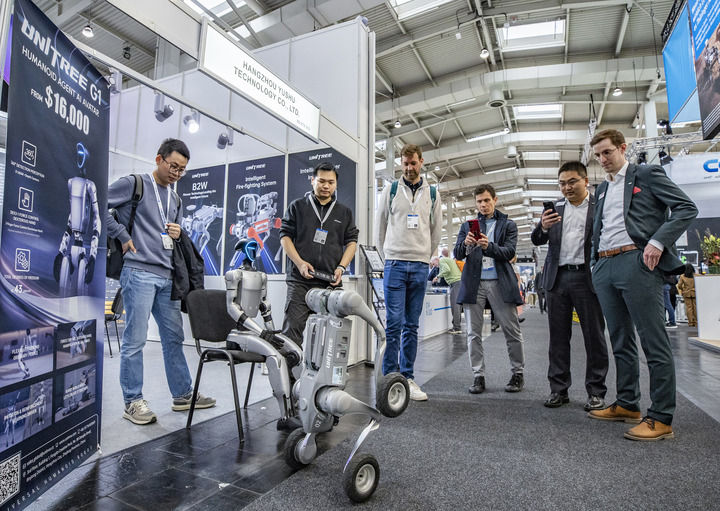 2025年4月1日,在德國漢諾威工業(yè)博覽會上,人們在宇樹科技展區(qū)觀看機(jī)器狗演示。新華社記者 張帆 攝
