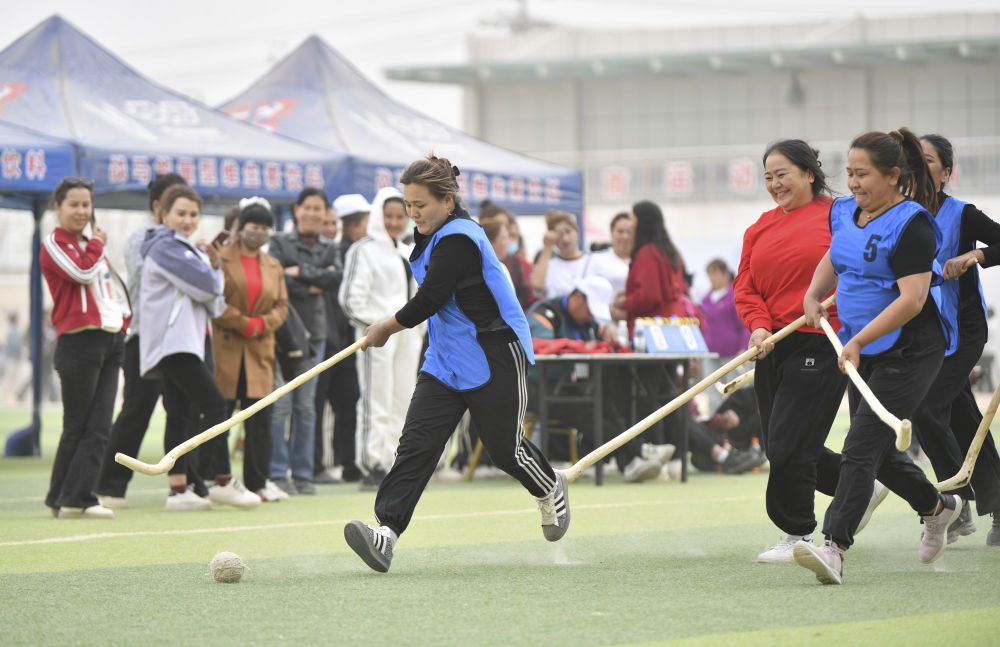 39歲的阿依古麗·買托合提是球隊里最年長的隊員。她身穿皮衣、腳踏休閑鞋,奔跑在正午驕陽下,屢屢揮動球桿,拼搶也毫不遜色。一起訓練的隊友有人穿著牛仔褲,有人穿著襯衫,還有人穿著后跟略高的鞋子。紅色的球洞穿由兩個塑料水瓶組成的球門,得分的一方歡呼不已,失球的隊員則懊惱地擦去臉上的沙塵。
