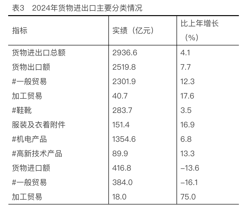 2024年,溫州全年貨物進(jìn)出口總額2936.6億元,比上年增長4.1%,其中出口2519.8億元,主要涉及鞋、服、機(jī)電產(chǎn)品等領(lǐng)域。貿(mào)易空間持續(xù)拓展,對共建“一帶一路”國家、東盟、拉丁美洲出口額分別比上年增長6.8%、16.3%、12.6%。
