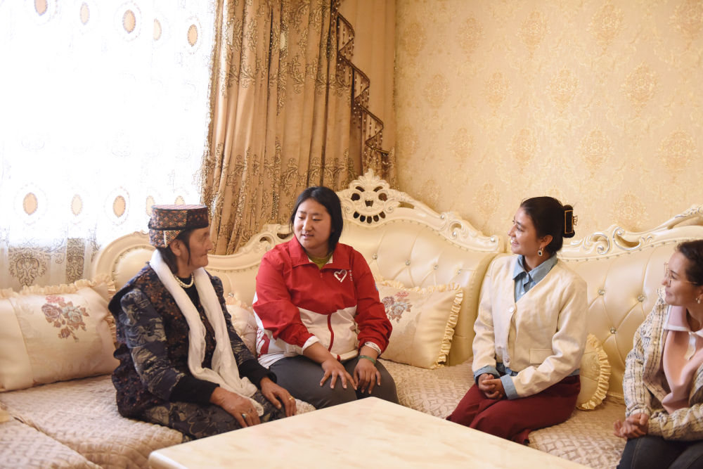 在新疆塔什庫(kù)爾干塔吉克自治縣,志愿者黃薈如(左二)在轄區(qū)內(nèi)入戶走訪(2025年4月14日攝)。新華社記者 高晗 攝
