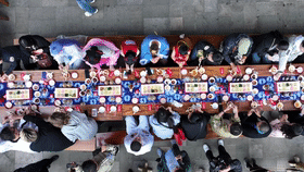 因?yàn)殡娪啊赌倪?》而火爆“出圈”的貴陽(yáng)越界影城,經(jīng)常舉辦“花式寵粉”的活動(dòng)。比如在影城門(mén)口擺起具有當(dāng)?shù)靥厣摹敖z娃娃”長(zhǎng)桌宴。