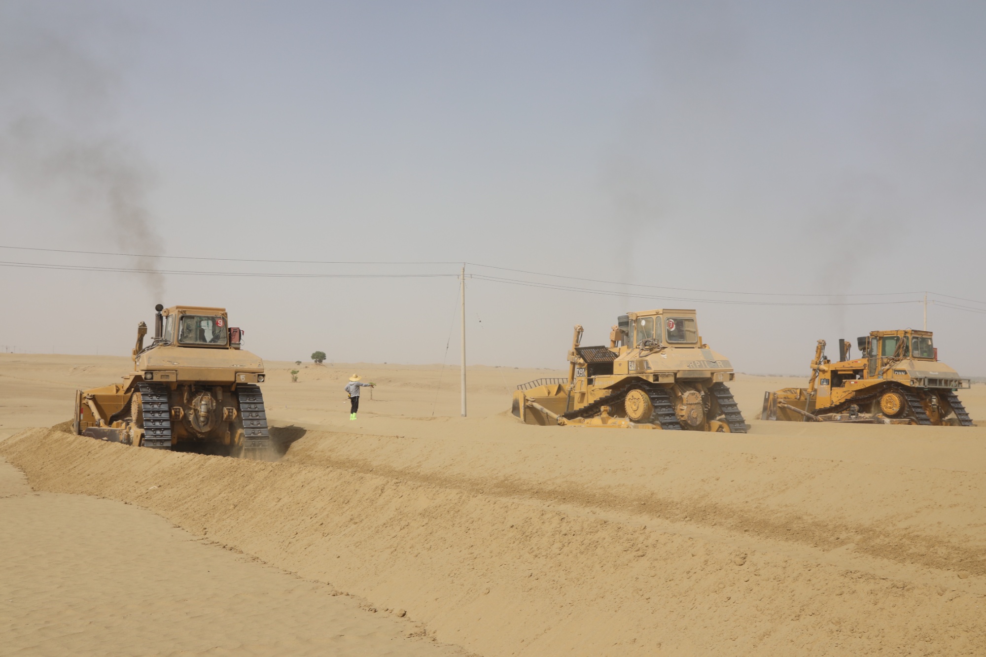 防沙治沙項(xiàng)目現(xiàn)場,大型機(jī)械正在平整沙漠 (日孜完古麗·買吐地 攝)