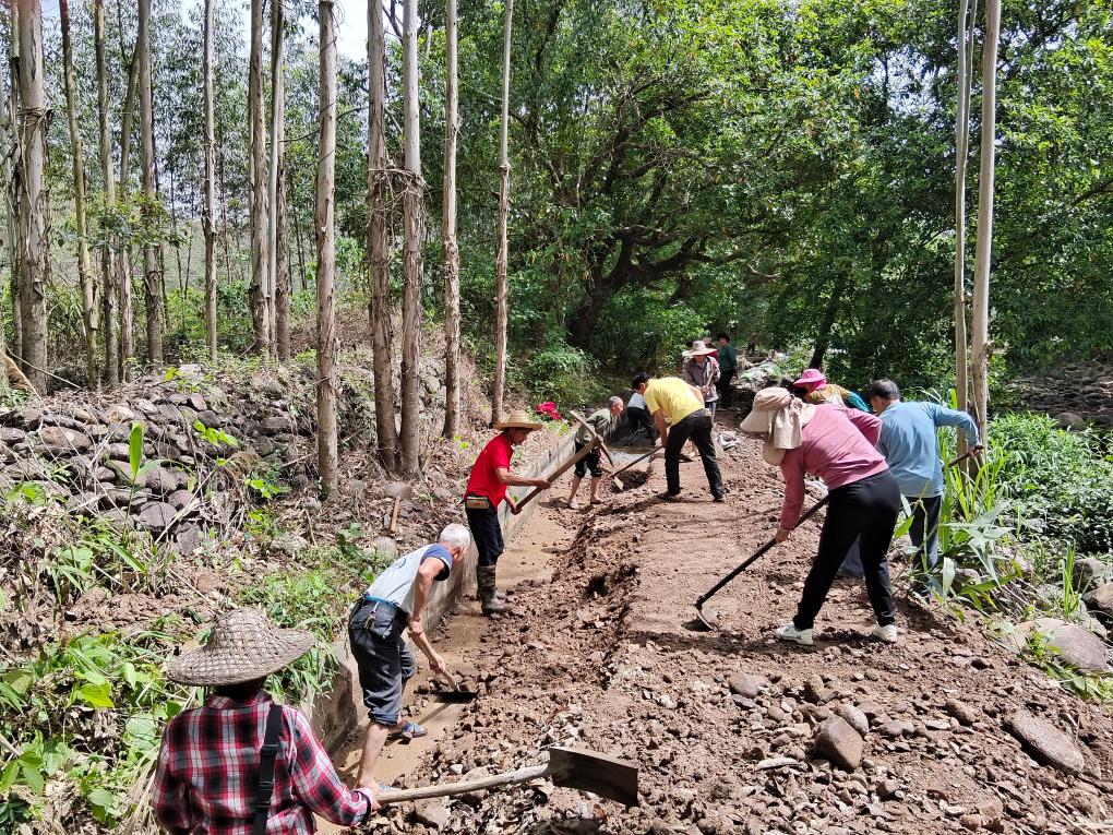 廣西武宣縣東鄉(xiāng)鎮(zhèn)屯應村黨員干部與群眾一起修水渠抗旱。(雷正曉 攝)