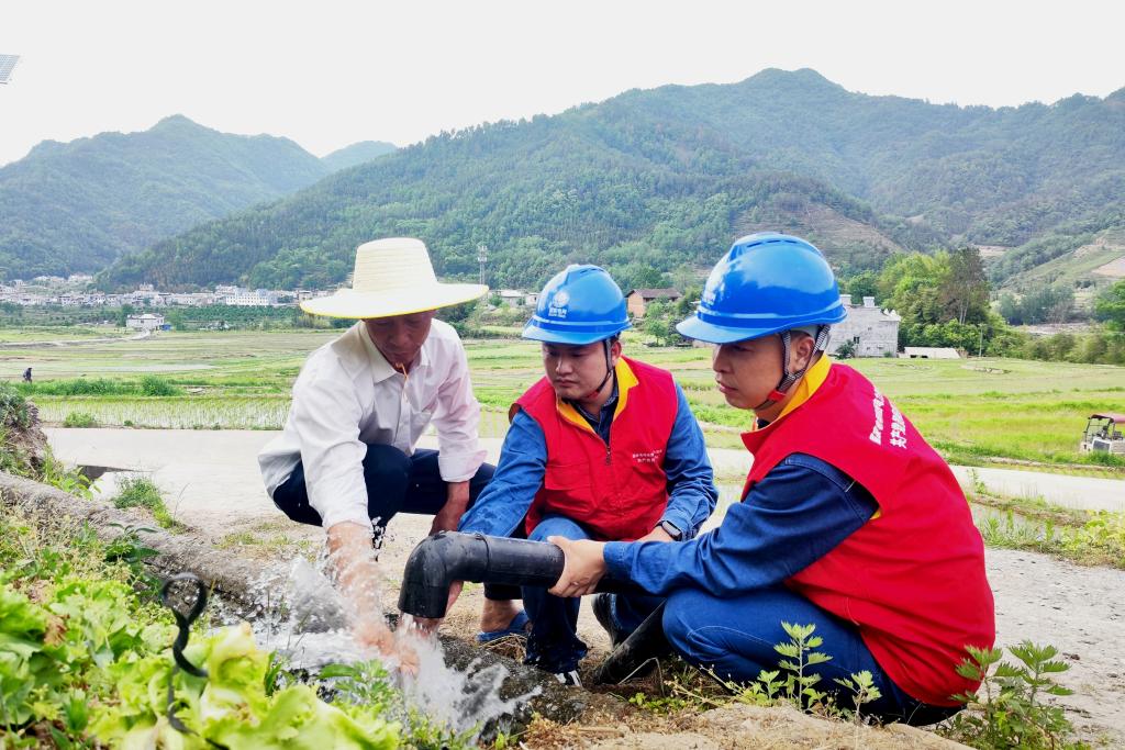 國家電網(wǎng)陜西省平利縣供電公司黨員服務隊在陜西平利縣秋河村幫助農(nóng)戶調(diào)試抽水水泵。(陳思源 攝)