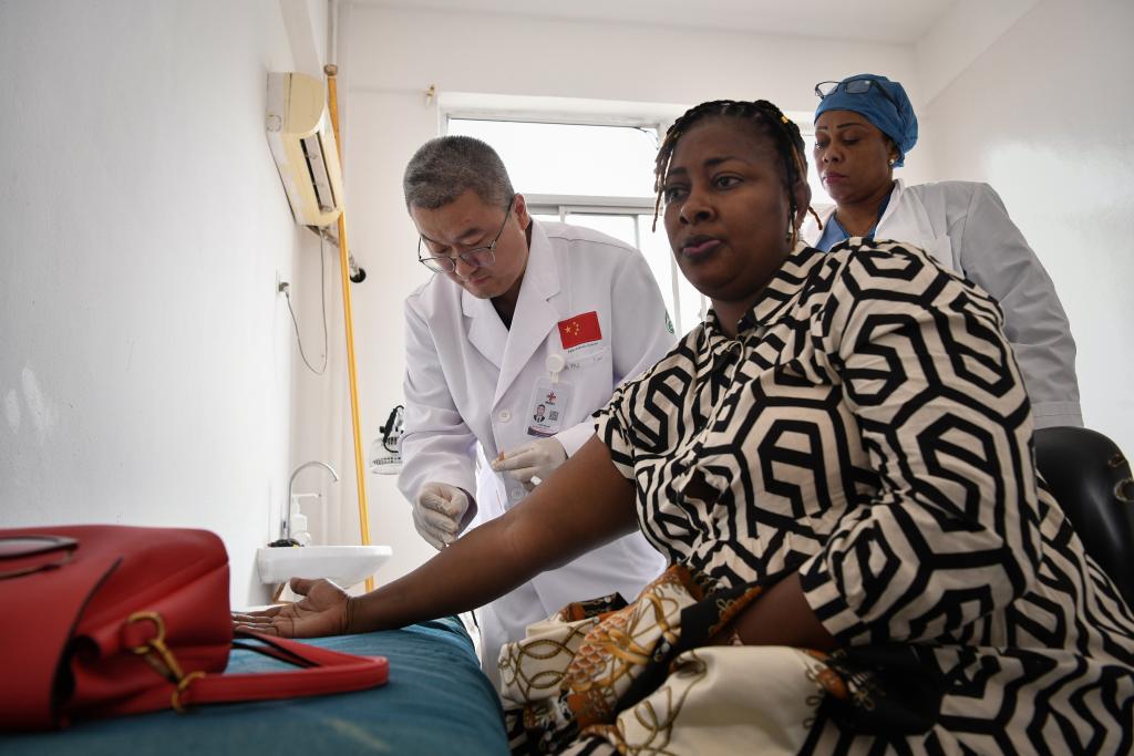 2025年4月29日,在位于幾內(nèi)亞首都科納克里的中幾友好醫(yī)院,中國醫(yī)療隊醫(yī)生劉路遙為患者做針灸治療。新華社記者韓旭攝