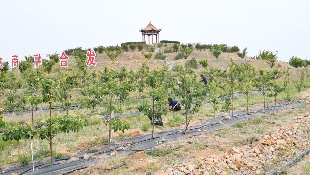 在淄博市沂源縣魯村鎮(zhèn)龍子峪村酥梨園,工作人員在進行夏季管護。幾年前這里還是一座荒山,2022年,沂源桃花島農(nóng)業(yè)發(fā)展有限公司流轉(zhuǎn)了這片山地,改造為酥梨園。