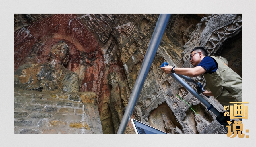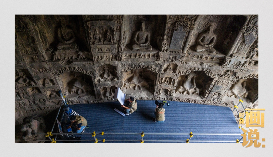 龍門石窟研究院工作人員在古陽洞使用關(guān)節(jié)臂掃描儀對佛像進(jìn)行數(shù)字化掃描