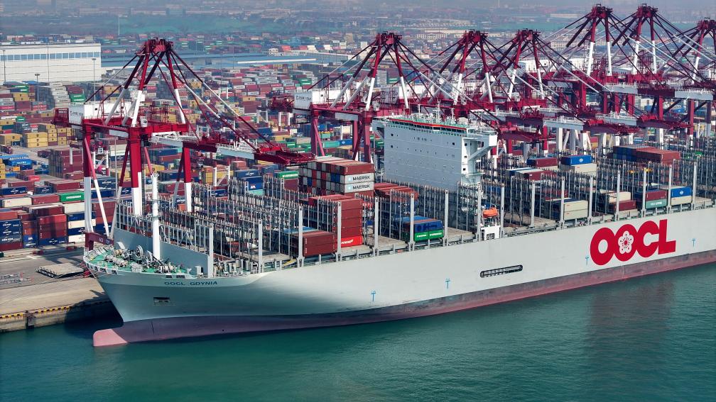 4月10日,一艘集裝箱貨輪在山東港口青島港前灣集裝箱碼頭進(jìn)行裝卸作業(yè)(無(wú)人機(jī)照片)。新華社記者 李紫恒 攝