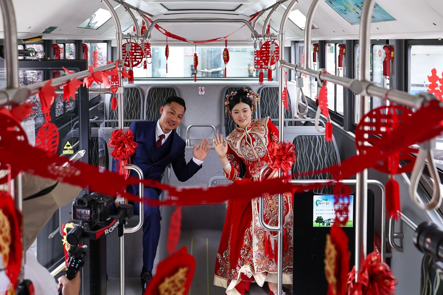 2025年4月30日,“愛情巴士”搭載著新郎新娘前往浙江諸暨市同山鎮(zhèn)唐仁村祠堂進(jìn)行婚禮儀式。新華社記者 江漢 攝