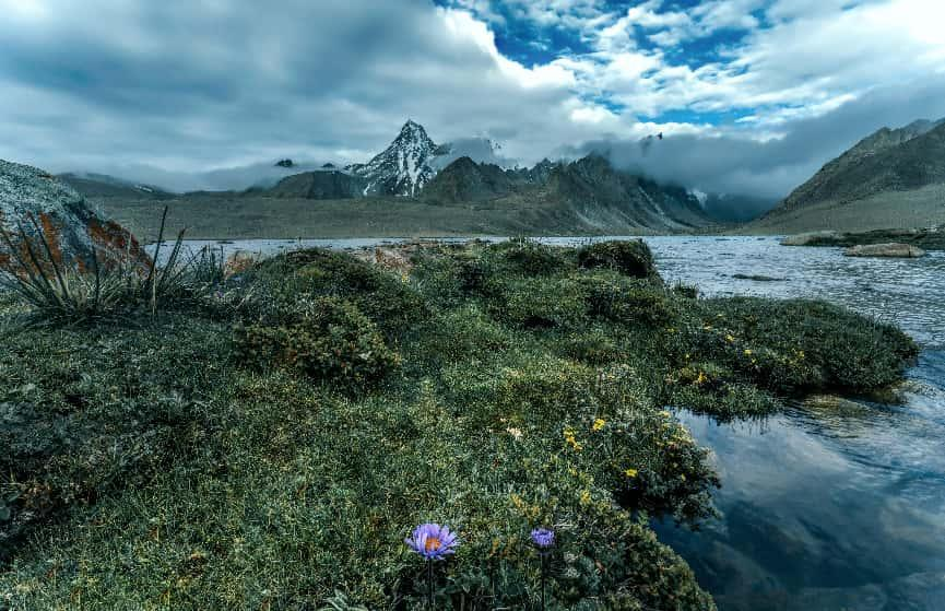 第二天一早,我們繼續(xù)向山脈的腹地去探索,前往冷布崗日腹地的道路也是無人踏足的,沒有正規(guī)車道的,所以我們同樣只能沿著牧民留下的車轍印前行。在一望無際的高原上,我們找不到路的時候就操縱無人機升空去探索路線。經(jīng)過了一整天的艱難探索,終于抵達了目的地,這個地方再往上走是完全沒有路了。在海拔約5800米左右的這個地方,不僅有巍峨壯美的雪山,還長著很多這種獨特的高山苔蘚,這種植被通常只分布在海拔4000米以上的地區(qū),極具地域特色。所以在拍攝時,我將這些高原特有的植被作為前景,既展現(xiàn)了高原生態(tài)風(fēng)貌,也作為海拔高度的天然標識,然后遠處雄偉的冷布崗日雪山則構(gòu)成了畫面的核心部分。