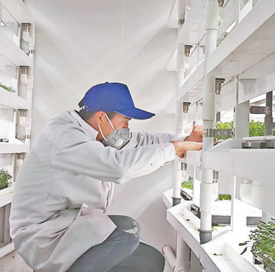 庫車市甬庫同心村智慧農業(yè)植物工廠育苗室內,工作人員在仔細觀察幼苗。 王紅麗攝