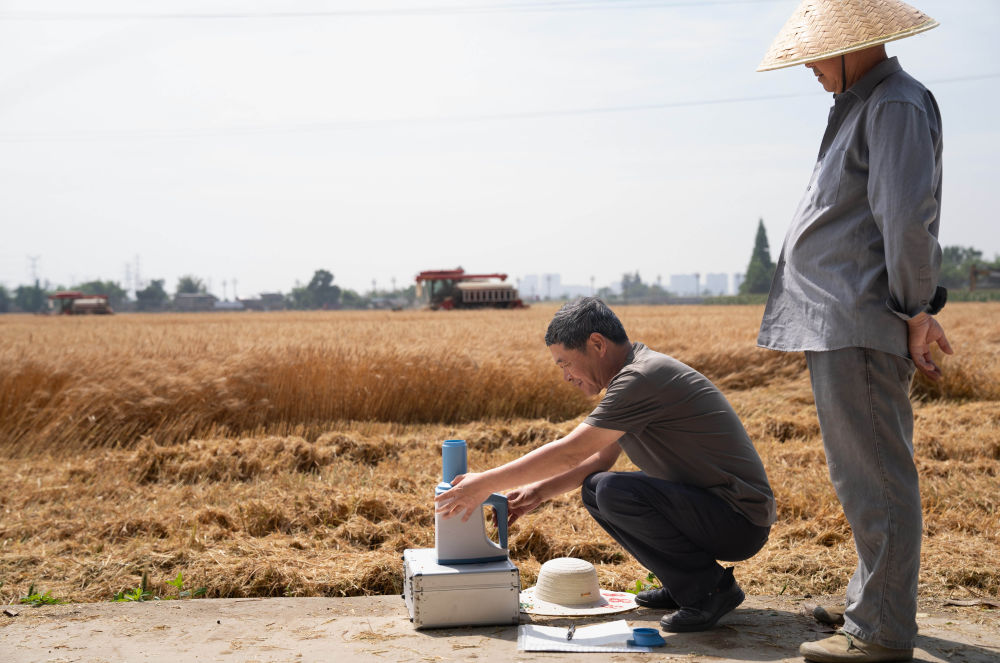 5月15日,工作人員在四川廣漢市南豐鎮(zhèn)雙福村測量剛收獲小麥的水分。