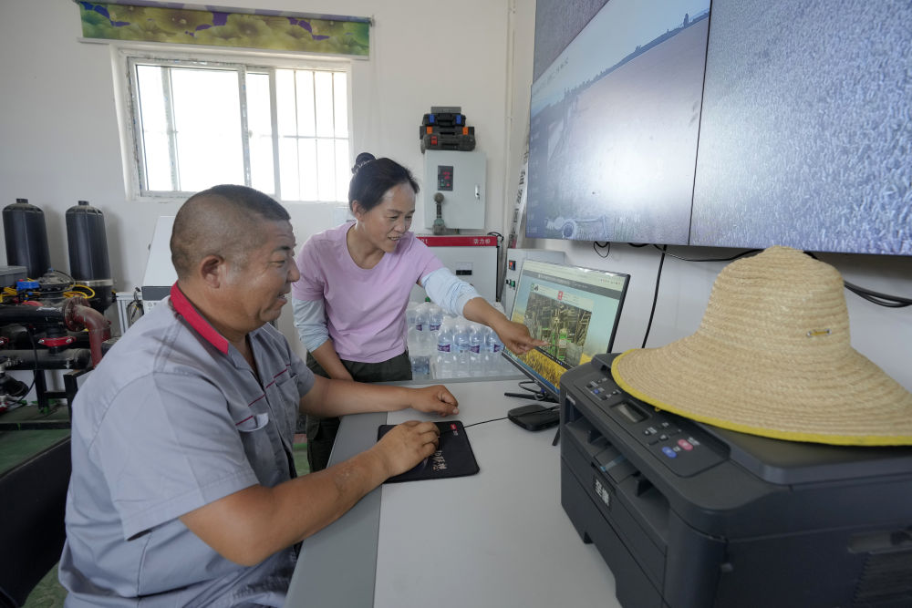 在山西省運城市鹽湖區(qū)解州鎮(zhèn)曲村,董會龍(左)和妻子范月親通過農機精準作業(yè)平臺查看農機手作業(yè)情況。董會龍夫妻是運城市鹽湖區(qū)解州鎮(zhèn)的種糧大戶。(5月27日攝)。