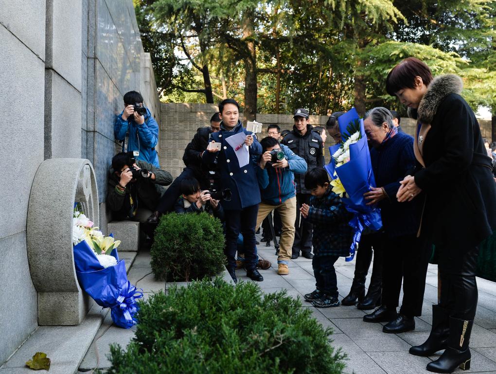 ↑2016年12月3日,夏淑琴(右二)和家人在侵華日軍南京大屠殺遇難同胞紀(jì)念館向遇難者獻花。