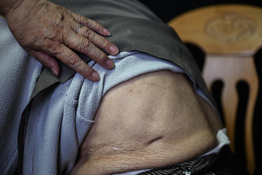 ↑2025年5月21日,夏淑琴展示自己身上的刀疤。