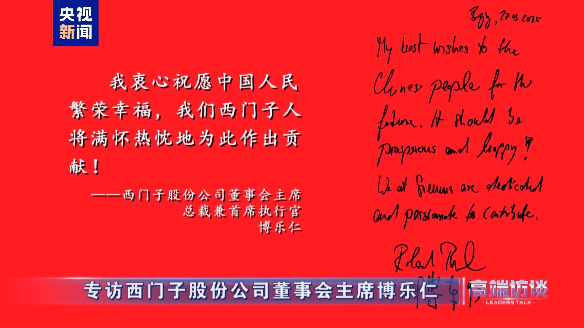 西門子股份公司董事會(huì)主席總裁兼首席執(zhí)行官博樂仁在接受總臺專訪后題詞