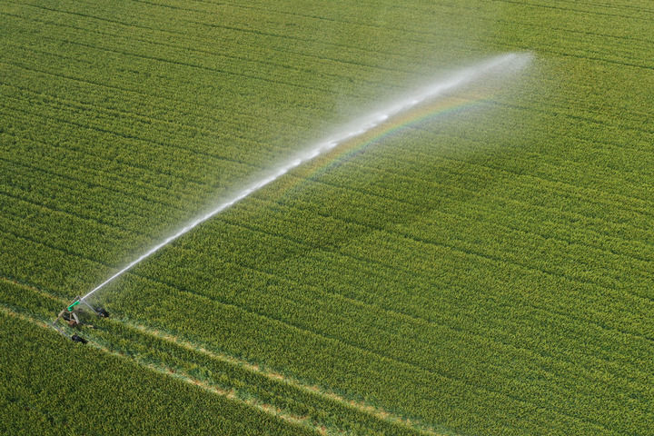 2025年5月7日,一臺自走式噴灌機在河南省焦作市溫縣黃莊鎮(zhèn)南韓村麥田間作業(yè)(無人機照片)。新華社發(fā)(徐宏星攝)