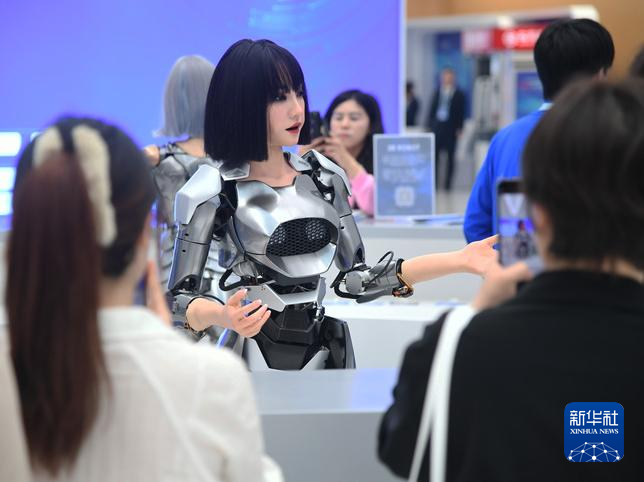 仿生人形機器人在2024中關村論壇年會會場設置的咨詢臺“迎賓”(2024年4月27日攝)。新華社記者 任超 攝
