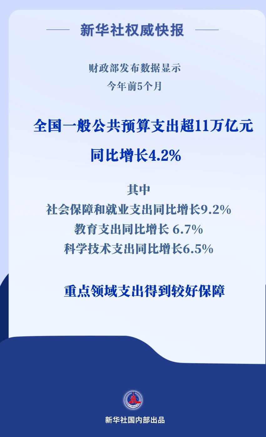 數(shù)據(jù)顯示,全國一般公共預(yù)算支出持續(xù)增長,前5個月達(dá)112953億元,同比增長4.2%。各級財政部門加大支出強度,優(yōu)化支出結(jié)構(gòu),持續(xù)加強對重點領(lǐng)域的支出保障。