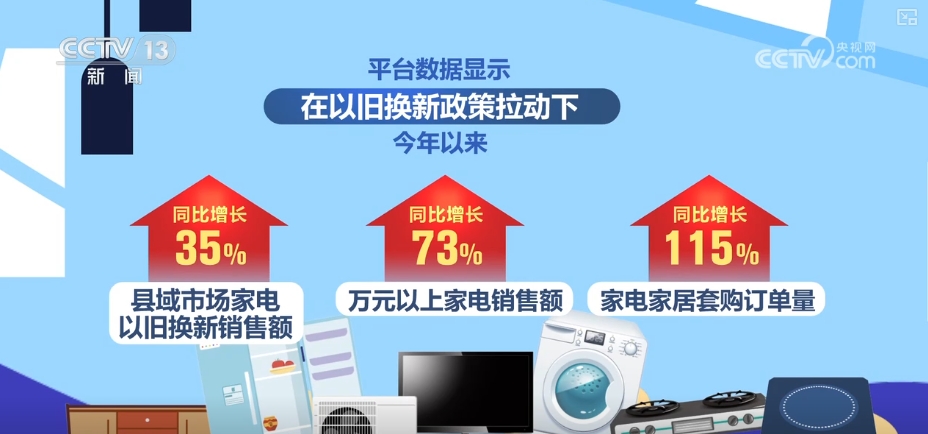 平臺(tái)數(shù)據(jù)顯示,在“以舊換新”政策拉動(dòng)下,2025年以來,縣域市場家電“以舊換新”銷售額同比增長35%,萬元以上家電銷售額同比增長73%,家電家居套購訂單量同比增長115%。