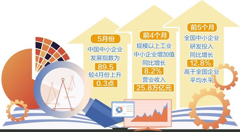 中國中小企業(yè)協(xié)會發(fā)布的最新數據顯示,5月份中國中小企業(yè)發(fā)展指數為89.5,較4月份上升0.3點。今年以來,中小企業(yè)回升向好態(tài)勢明顯,創(chuàng)新活力持續(xù)釋放。