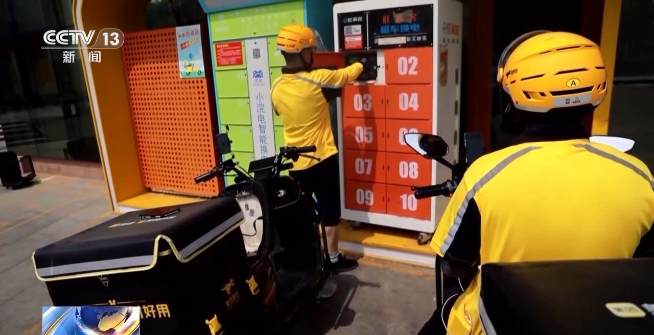 外賣(mài)員 崔鳳洋:給我們提供了很方便的換電站,我們?nèi)绻叻迤跊](méi)有電了,可以來(lái)這里換電,如果中午非常熱,感到身體有點(diǎn)難受可以到這來(lái),也提供解暑藥品。
