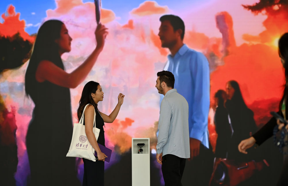 6月24日,兩位嘉賓在國家會(huì)展中心(天津)論壇會(huì)場設(shè)置的走廊空間交流。新華社記者趙子碩攝