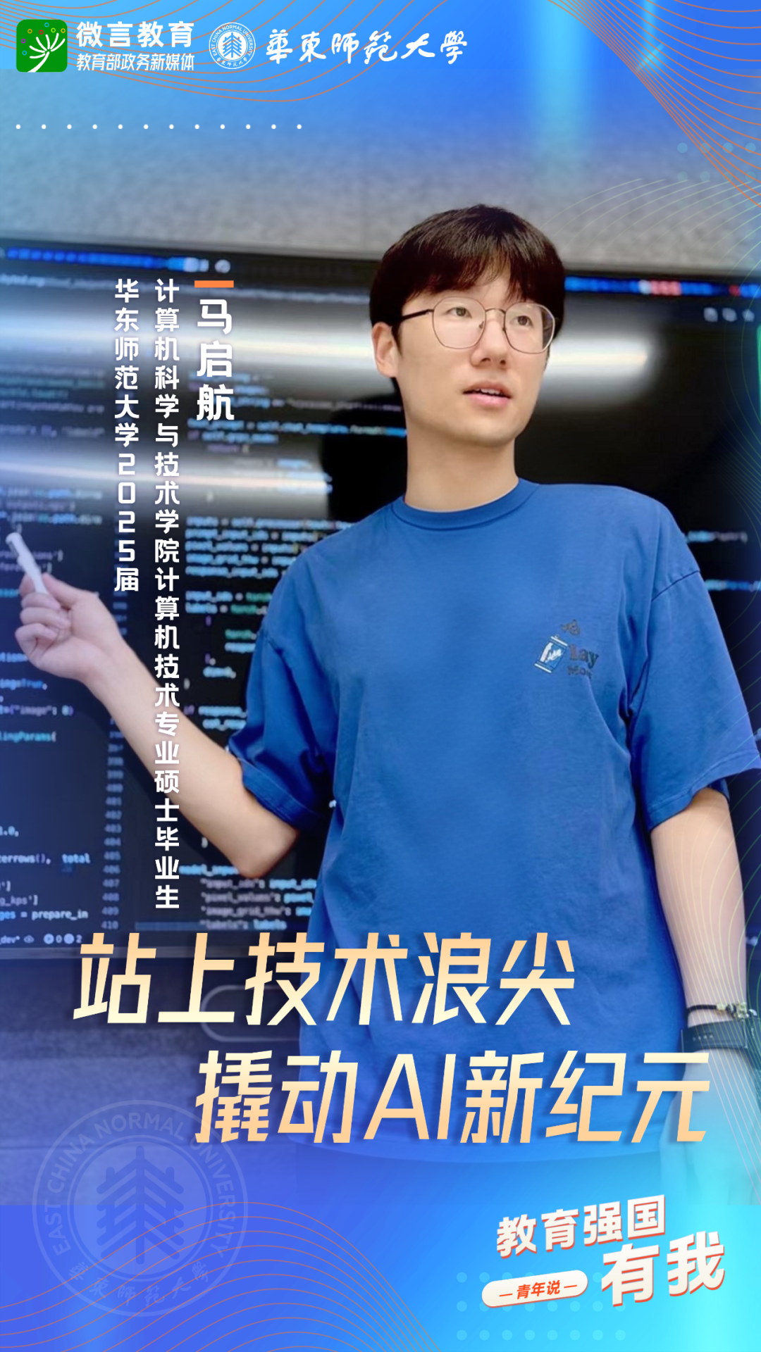 習(xí)近平總書記強(qiáng)調(diào),希望廣大青年堅(jiān)定理想信念,厚植家國(guó)情懷,練就過(guò)硬本領(lǐng),發(fā)揚(yáng)奮斗精神,到祖國(guó)和人民最需要的地方發(fā)光發(fā)熱,為中國(guó)式現(xiàn)代化建設(shè)貢獻(xiàn)青春力量。教育強(qiáng)國(guó)建設(shè),青年何為?教育部政務(wù)新媒體推出“教育強(qiáng)國(guó),有我!”網(wǎng)絡(luò)主題宣傳活動(dòng)之“青年說(shuō)(報(bào)國(guó)篇)”系列,展現(xiàn)青年學(xué)子將個(gè)人理想融入國(guó)家發(fā)展的青春擔(dān)當(dāng)。今天,跟教育小微通過(guò)1個(gè)視頻和1組海報(bào),一起來(lái)看華東師范大學(xué)學(xué)子如何“向新而行”——