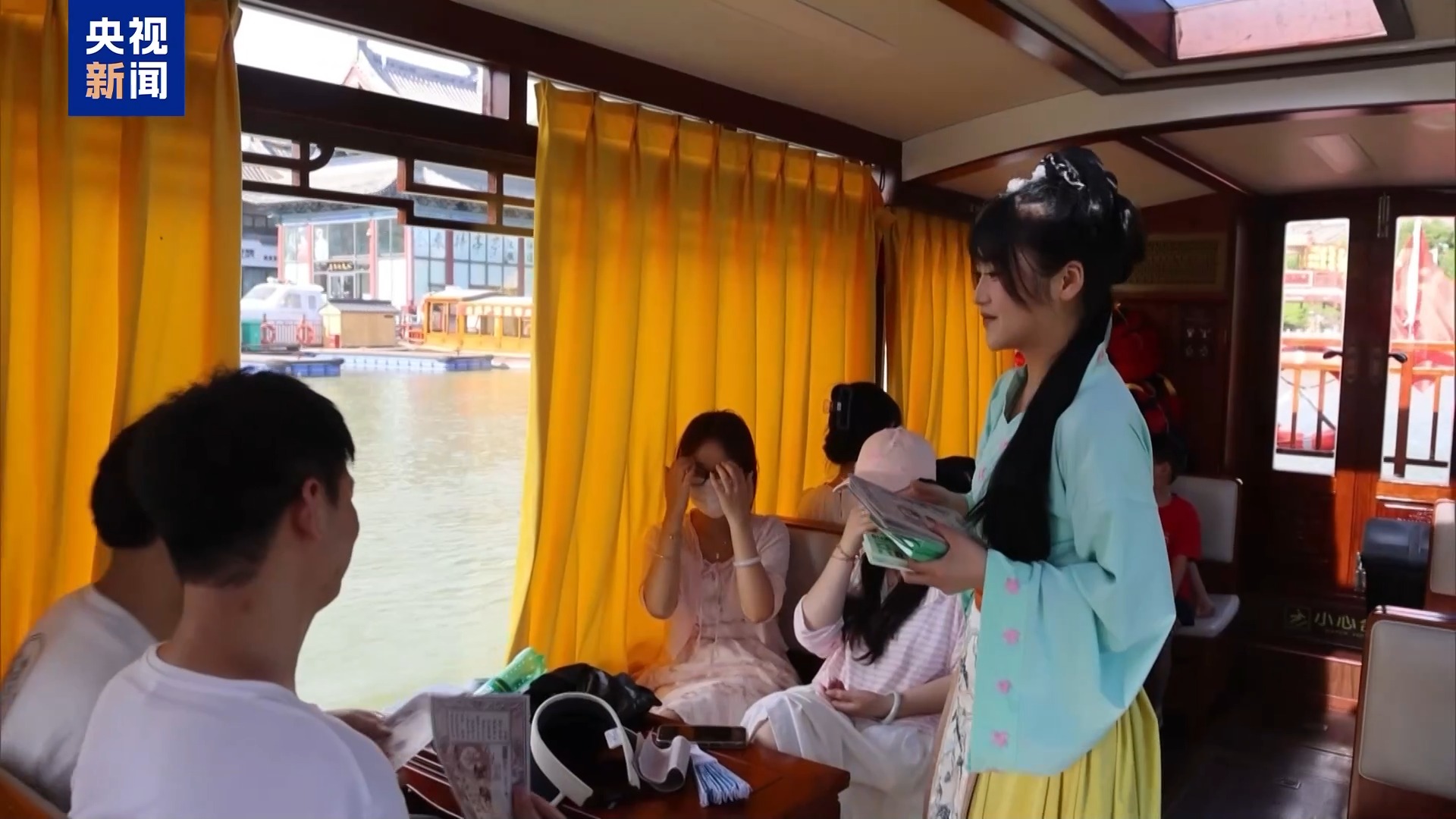 在河南開封,游客能坐船體驗(yàn)“宋朝人的一天”,船上設(shè)有互動(dòng)詩詞小游戲,市內(nèi)的八大景區(qū)通過汴河水道“串珠成鏈”,吸引游客參與其中。