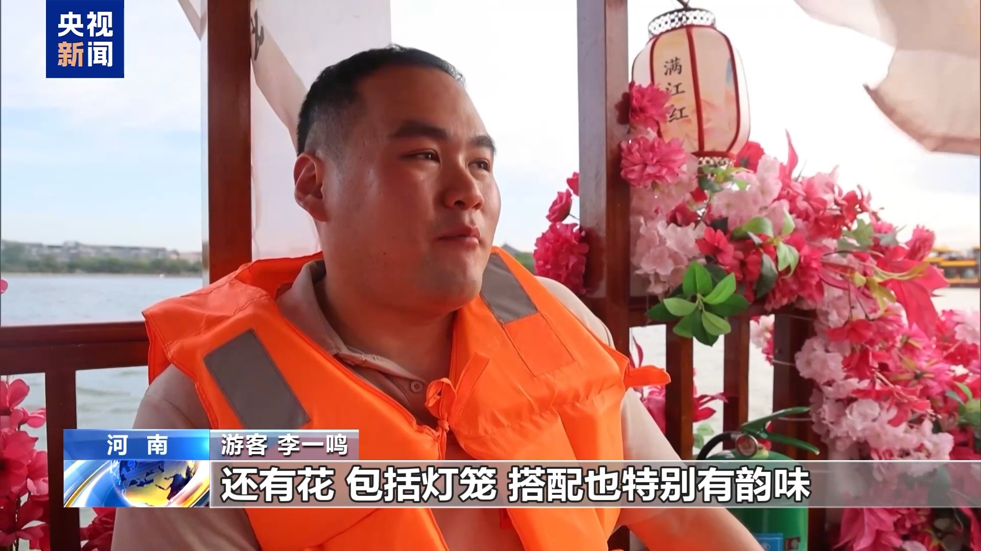 游客 李一鳴:置身于這個(gè)歷史古城之中,就像《清明上河圖》里面的人物一樣。船上裝點(diǎn)的古典詩詞,還有花,包括燈籠,搭配特別有韻味。