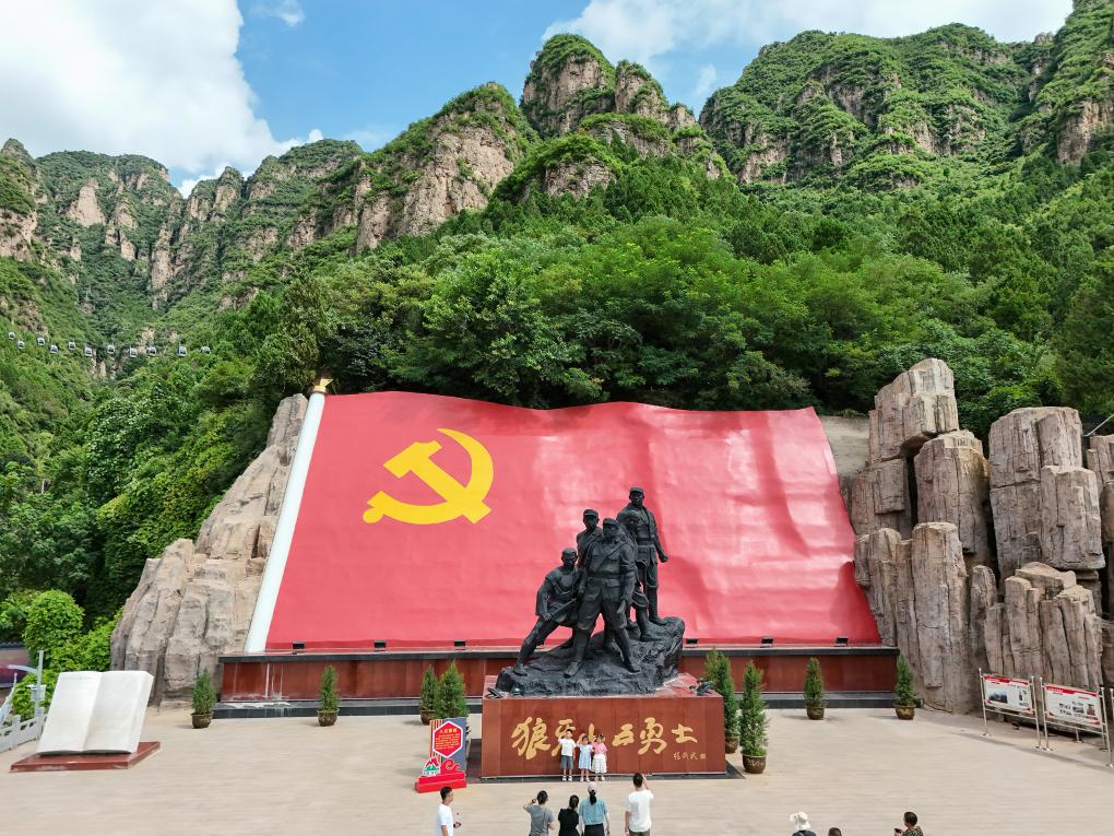 7月6日,游人在狼牙山五勇士雕像前拍照留念(無(wú)人機(jī)照片)。新華社記者 李鑫 攝