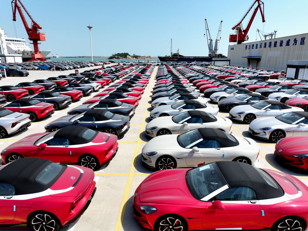 6月16日,在江蘇省連云港港東方港務(wù)分公司碼頭,大批車(chē)輛等待裝船外運(yùn)(無(wú)人機(jī)照片)。新華社發(fā)(王春攝)