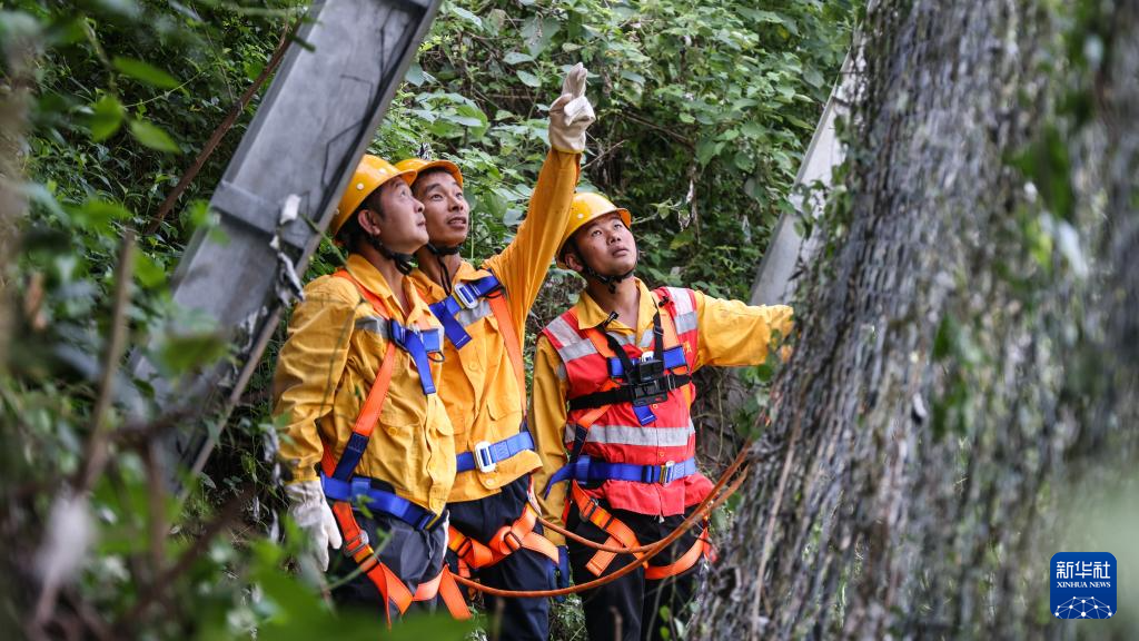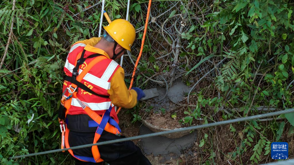 橋隧工人清除被動(dòng)網(wǎng)上的藤蔓和雜草(7月15日攝,無(wú)人機(jī)照片)。