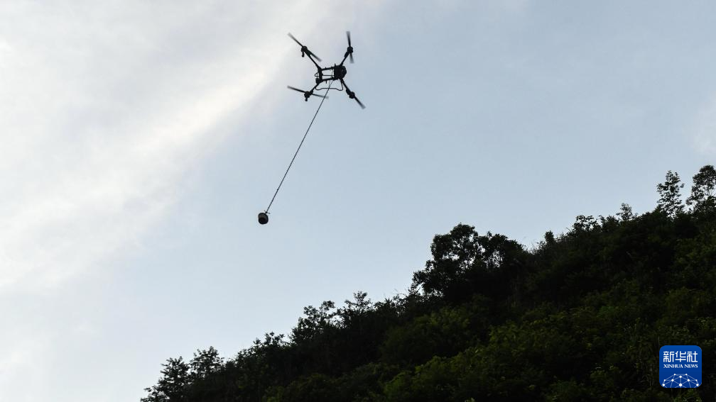 橋隧工人遙控?zé)o人機(jī)給隧道山體上的施工點(diǎn)運(yùn)送混凝土(7月15日攝)。