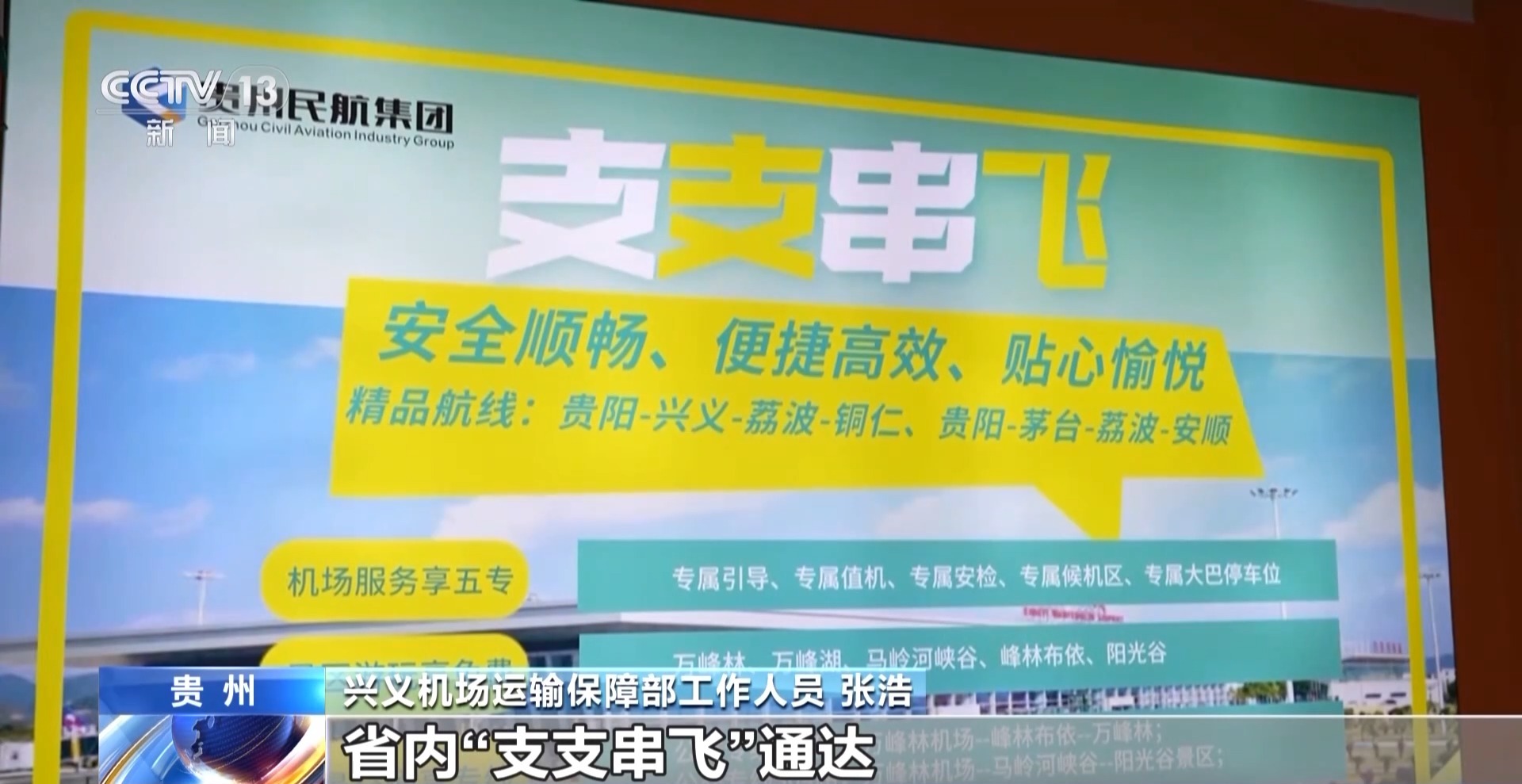 興義機(jī)場(chǎng)運(yùn)輸保障部工作人員 張浩:目前21條航線覆蓋21座城市,省內(nèi)“支支串飛”通達(dá)銅仁、荔波、遵義茅臺(tái)等航點(diǎn),興義到貴陽(yáng)的“貴陽(yáng)快線”保持每天3班執(zhí)飛。