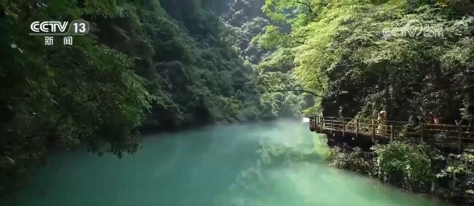 在大峽谷谷底,形態(tài)各異的峰林與緩緩流淌的溪水構成了天然畫卷,陣陣微涼的山風吹來,游客們仿佛漫步在原始森林中,在喧囂的夏天中感受到了一份難得的靜謐和涼爽。