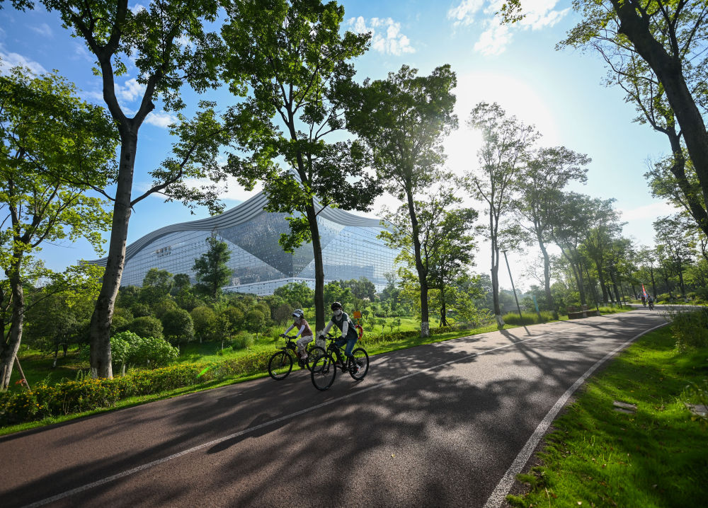 資料圖:人們?cè)诔啥几咝聟^(qū)桂溪生態(tài)公園騎行 。新華社記者 王曦 攝