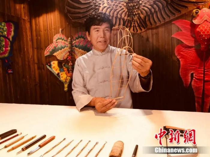 圖為國(guó)家級(jí)“非遺”項(xiàng)目“天津風(fēng)箏魏制作技藝”第四代傳承人魏國(guó)秋正在制作風(fēng)箏