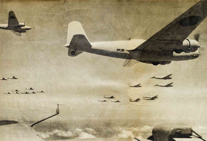 這是侵華日軍大編隊轟炸機(jī)群飛向重慶,準(zhǔn)備進(jìn)行轟炸(資料照片,翻拍)。新華社發(fā)