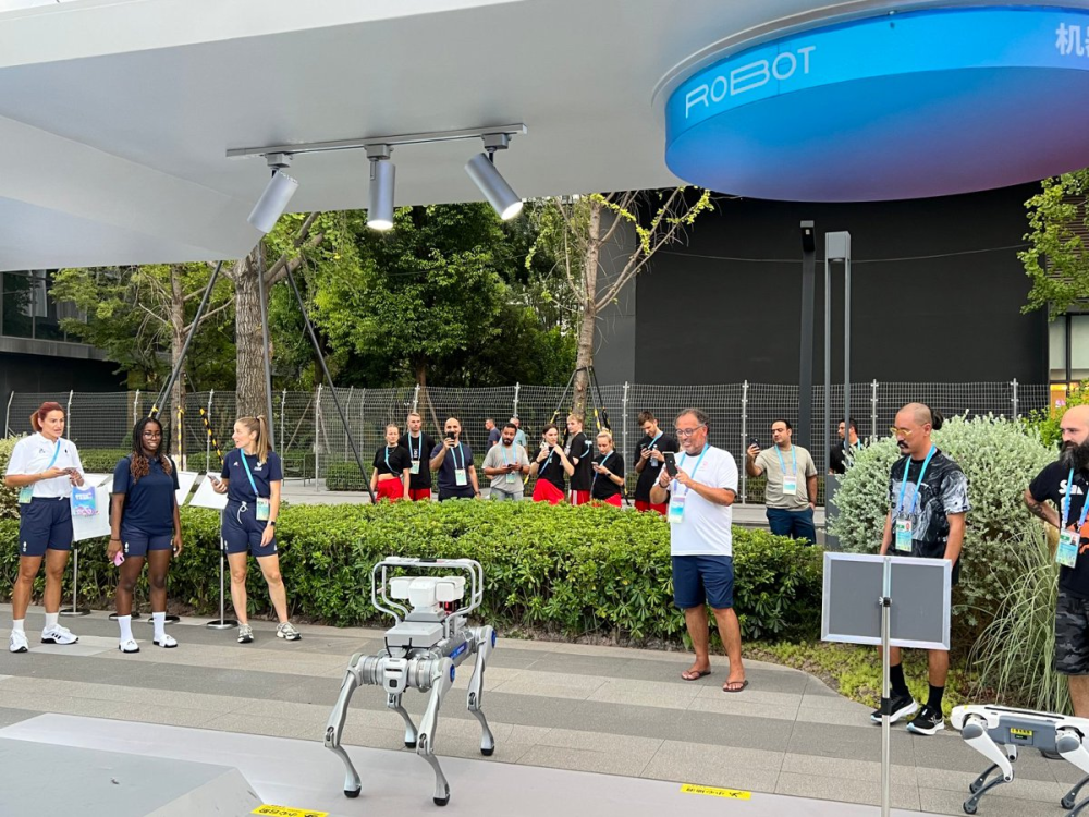 戴上AR翻譯眼鏡,葡萄牙運動員和德國選手開啟無障礙暢聊;美國選手一句“GoGo,帶我去熊貓商店”,智能機器狗聞聲而動;土耳其選手和智能運動搭子練起了球;澳大利亞姑娘欣賞著美甲機器人噴繪的熊貓圖案……
