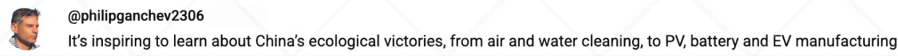 網(wǎng)友@philipganchev2306表示,“從空氣和水凈化到光伏、電池和電動汽車制造,了解中國在生態(tài)領(lǐng)域取得的成就令人鼓舞。”