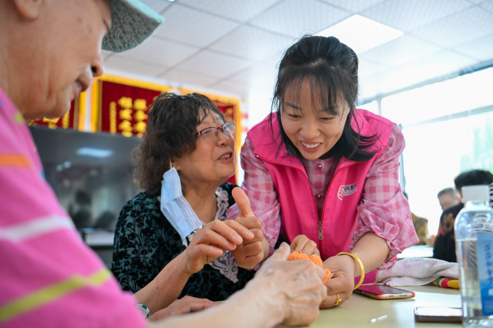 在天津市河西區(qū)賓西樓居家養(yǎng)老服務(wù)中心,劉緩緩(右)鼓勵一名在“老年大學(xué)”課上制作手工飾品的老人(5月23日攝)。新華社記者 孫凡越 攝