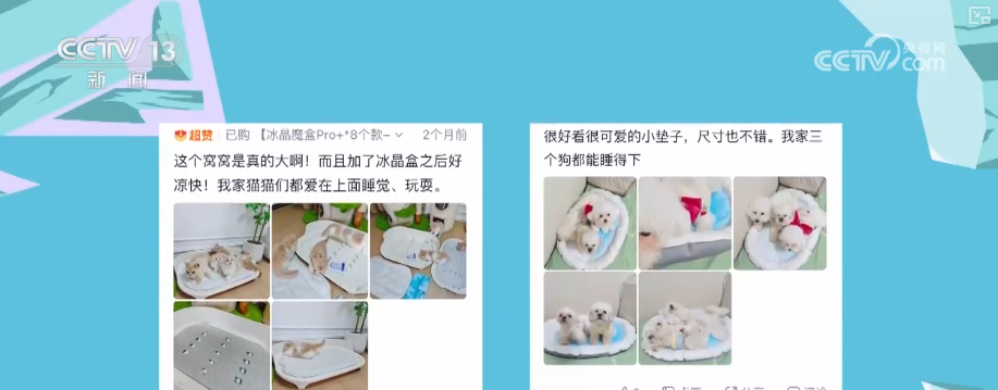 高溫還催熱了“它經(jīng)濟(jì)”。在網(wǎng)購平臺上搜索關(guān)鍵詞“寵物降溫”,寵物空調(diào)房、冰墊、冰絲圍巾、寵物專用空調(diào)等商品琳瑯滿目。一件30塊錢左右的基礎(chǔ)款寵物冰墊,月銷量輕松破萬??烧{(diào)節(jié)風(fēng)速的寵物風(fēng)扇、能自動制冷的寵物窩等,同樣備受追捧。評論區(qū)的畫風(fēng)是這樣的“狗狗非常喜歡,玩得不亦樂乎”“貓咪睡覺終于踏實了”“家里的娃和毛孩子都很喜歡”。