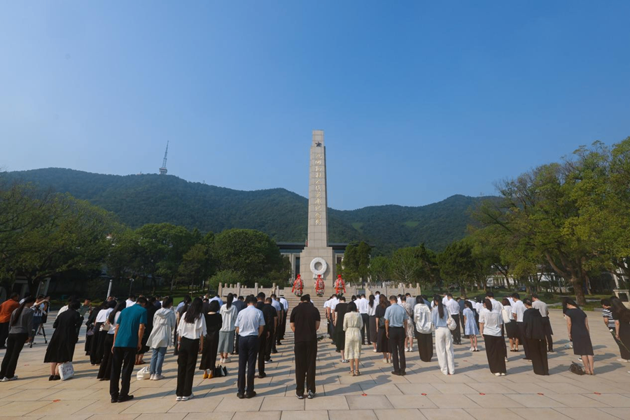8月21日上午,參賽選手們前往無(wú)錫市革命烈士陵園,向人民英雄紀(jì)念塔敬獻(xiàn)花籃。(海外網(wǎng) 謝明 攝)